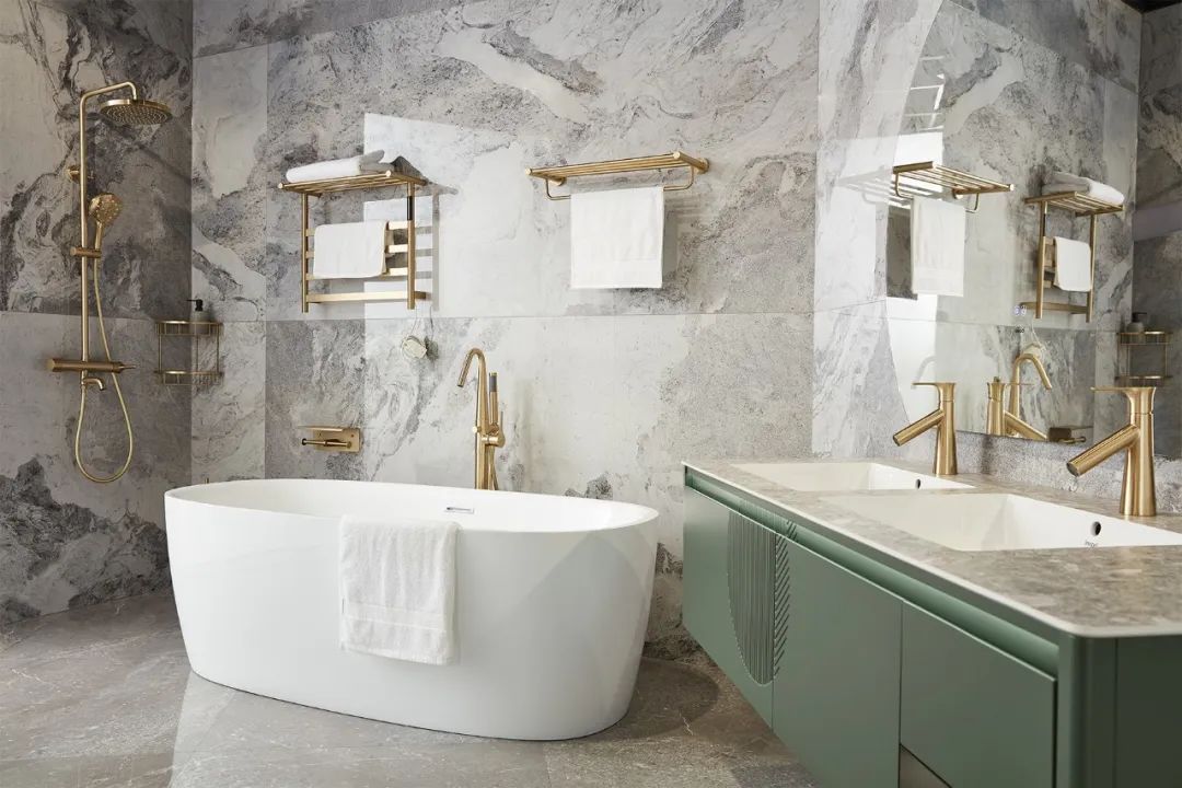 面對潮濕的浴室環境,流沙金系列材質具有一定的耐腐蝕性,能夠抵抗日常使用中的水分和污垢腐蝕,保持長久如新的外觀。同時具有一定的抗刮擦性,在日常使用中不易留下劃痕,能夠保持長期的平滑和光澤。